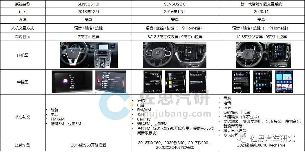 来源:佐思汽研《2020年合资品牌主机厂车联网产品分析报告》 沃尔沃最新一代车机系统于2020年11月首搭XC40纯电版上市,采用谷歌Android Automotive OS系统,搭载华为HMS for Car智慧车载云服务、科大讯飞语音、天猫精灵车家互联、腾讯爱趣听等。其中华为HMS for Car智慧车载云服务解决方案提供华为应用市场、华为快应用和华为智慧助手服务、My Car、华为音乐以及华为视频等应用服务。 通过OTA升级,未来车载微信等功能也将导入沃尔沃新一代车机系统。与此同时,沃尔沃还将联合华为、中国联通打造下一代5G智能车联网系统。 图:沃尔沃车机系统迭代历程