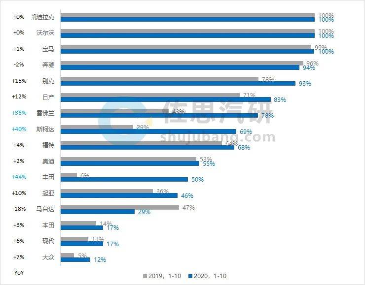 来源:佐思汽研《2020年合资品牌主机厂车联网产品分析报告》 2020年1-10月,合资品牌车联网装配率已较上年同期的35.6%增加14.3个百分点。其中,丰田、雪佛兰、斯柯达的装配率同比增幅均超过30%,这是因为2019年丰田将智行互联系统引入国内,雪佛兰也于2018下半年推出广泛应用的MyLink+系统;斯柯达则在2020年上马上汽大众本土化车联网系统——智慧车联系统。 相比之下,奥迪、起亚虽然目前装配率不高,但已开始积极布局,如2020年12月,一汽大众奥迪已经携手百度车联发布奥迪 图:2019-2020年中国合资品牌车联网装配率(分品牌)