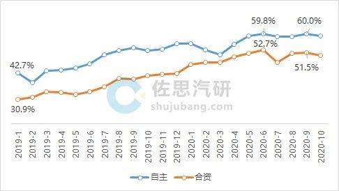2020年1-10月,合资车企车联网装配率为49.8%,与自主品牌的差距逐渐缩小。 汽车行业掀起“新四化”高潮,自主、合资纷纷发力网联化和智能化。其中,自主品牌借助本土资源,已在国内车联网市场占据先发优势,2019年1月合资品牌车联网装配率落后自主品牌11.8个百分点。自2019年以来,合资品牌已经开始提速,一方面加强底层技术研发、合作,推出更加安全、智能的车机系统;另一方面更加关注客户体验,通过合资、与BATH(百度、阿里、腾讯、华为)合作等方式积极提升车联网功能,以迎合中国消费者对车载娱乐、出行服务等领域的需求。2020年1-10月,合资品牌车联网装配率达到49.8%,与自主品牌(装配率57.7%)的差距缩小到7.9个百分点。 图:2019-2020年中国自主与合资品牌车联网装配率月度走势对比