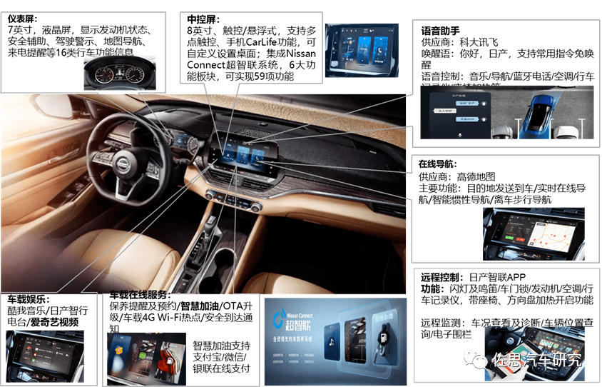 来源:佐思汽研《2020年国内合资品牌主机厂车联网产品分析报告》 未来,依托宝马中国开发团队(1100余人,其中软件超400人)以及2019年成立的数字化服务机构——领悦数字信息技术有限公司,宝马中国将继续探索并推出满足中国市场数字化体验的产品。 东风日产于2020年7月发布“智联未来”计划,其主要包含:1、2020年推出8款搭载Nissan Connect 超智联系统的车型;2、2021年搭载车联网系统的车型将占80%;3、2020-2024年,Nissan Connect 超智联系统进行4次迭代。 Nissan Connect 超智联是日产智行(Nissan Intelligent Mobility)五大核心技术之一,包含远程在线、掌控在线、资源在线等6大功能板块,59项功能。其中,资源在线板块包含了在线支付(微信、支付宝、银联在线)、第三方APP账号绑定、智慧加油(支持在线支付)等,以及违章信息查询、安全到达提醒、车俩健康监测与维保预约等车辆安全功能,共计12项。截至2020年11月,日产2021款 图:东风日产2021款天籁主要亮点功能
