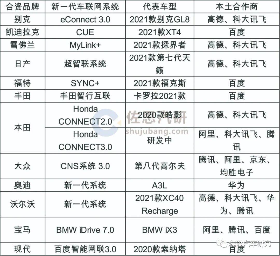 来源:佐思汽研《2020年合资品牌主机厂车联网产品分析报告》 未来,合资车企将呈现以下趋势: 1、预计2020全年国内合资车企的车联网装配率超过50%,2025年提升到70%左右。 2、与BATH 等国内企业深度合作,导入短视频、组队车行、快递到车、生物识别、车载微信、小程序、华为应用等新的车机功能,进一步提升用户体验,积极迎合中国消费者的互联网使用习惯。 3、加速车联网系统迭代、升级。目前,部分合资品牌车机尚不具备OTA升级功能,如丰田、本田等,相比之下,特斯拉、蔚来、小鹏等已具备整车FOTA能力。2020下半年,宝马、上汽通用等合资企业已开启大规模OTA升级。 4、引入V2X。如别克已经明确表示下一代车机将支持V2X;福特则将在2021年推出中国首款搭载V2X功能的量产车型。 表:主要合资品牌最新车联网系统及本土合作伙伴