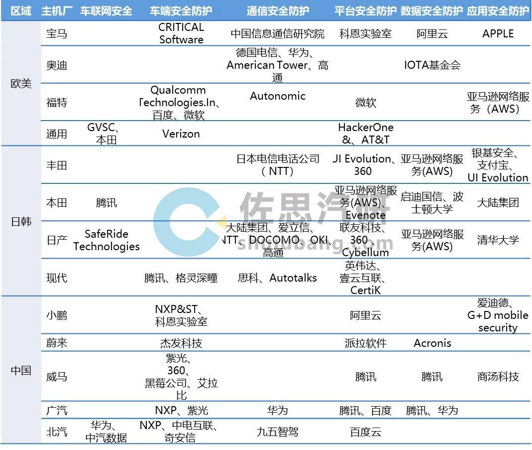 主机厂不断扩大信息安全领域合作 主机厂除加强自身安全防护能力外,近年来开始广泛寻求对外合作,合作范围已覆盖车端、通信端、平台、数据、应用等各个层级。 图:部分主机厂信息安全领域合作伙伴