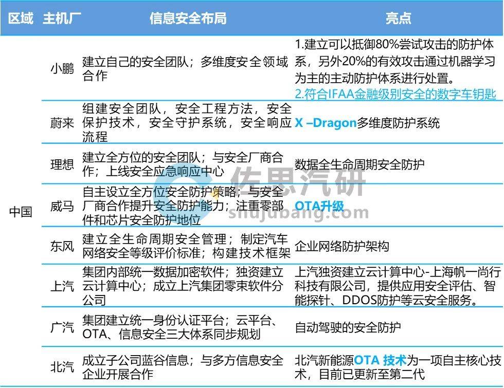 中国主机厂:新势力企业先行 中国新势力企业在信息安全防护方面可圈可点,例如小鹏汽车通过自建安全团队,并与阿里云、科恩实验室、艾迪德等伙伴合作的方式,从云端、车端、手机端同时部署,建立以主动防御为核心的防护体系。蔚来汽车也通过自建团队及多方合作,建立起X–Dragon多维度防护系统 中国传统车企也正在跟进,东风、上汽、广汽、北汽等更加关注企业全生命周期的安全管理。例如上汽在整体部署中,将下属企业加入集团信息安全保护与管理体系,内部统一采用数络加密软件(GS-EDS系统),保证集团整体的数据安全;其次,自建云平台,独资建立云计算中心,提供全品类的云安全服务;最后,成立上汽集团零束软件分公司,承担基础技术平台的研发,增强自己的软件研发能力。 图:中国主机厂信息安全布局