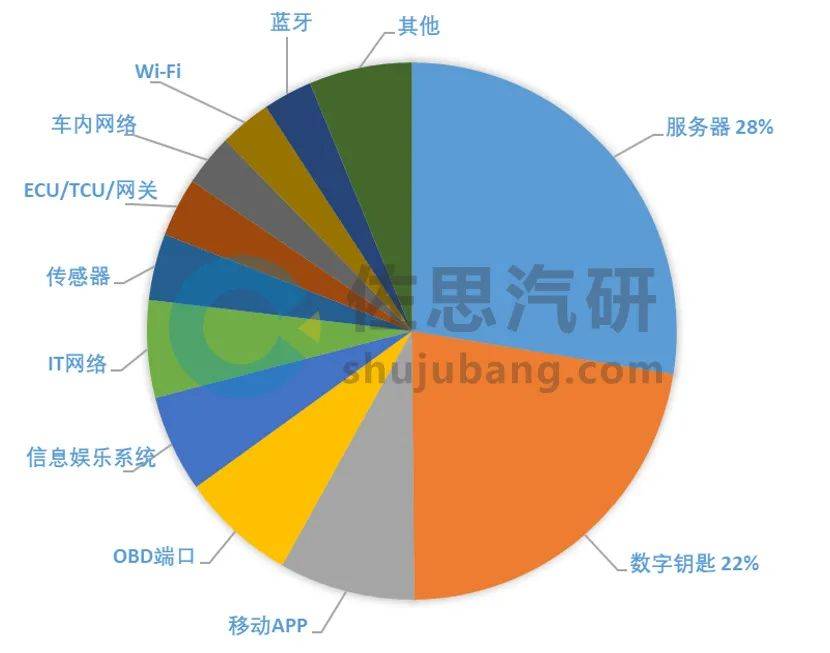 佐思汽研发布《2020主机厂信息安全布局研究报告》,对当前汽车信息安全现状和主机厂布局进行了梳理。 汽车信息安全事件频发,服务器、数字钥匙等成主要攻击端口 随着新四化发展,汽车智能化率不断提升,功能逐渐丰富。根据统计,2020年1-10月中国新车网联功能装配率已超过50%,2025年将达到75%左右。功能上,则向智能座舱、高等级自动驾驶方向演进,多模态交互、多屏互动、5G网络、V2X、OTA、数字钥匙等功能应用不断扩大。随之而来的,则是汽车控制代码逐渐增多,可攻击端口增加,面临的安全威胁加大。 从安全事件端口分布来看,目前的汽车信息安全事件主要集中在服务器、数字钥匙、移动APP、OBD端口等。 服务器是信息安全第一大端口,黑客可通过入侵操作系统、数据库、TSP服务器、OTA服务器等系统漏洞,对数据进行篡改、破坏,造成车端安全事故。服务器的攻击工具大多数为远程接入,成本相对较低;同时服务器存储的数据资产极其重要。这些特性导致了服务器攻击占比一直高居首位。 数字钥匙是信息安全第二大端口,是用于闯入和盗窃车辆的最常见攻击媒介之一。根据统计,2020年中国蓝牙数字钥匙装配率将超过30万,装配率有望接近4%,功能亦从基本的解闭锁与启动,延伸至账号登录、钥匙分享、车辆轨迹记录、快递到车等个性化配置,其对于车端安全的影响日益突显。 图:截至2020年全球汽车安全信息事件端口分布