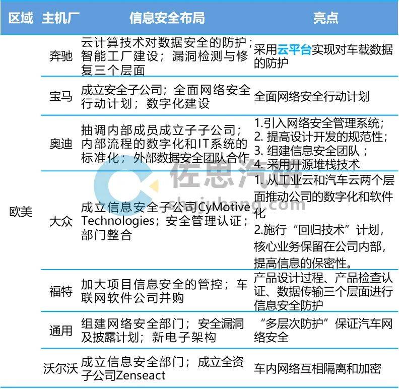 主机厂纷纷加快信息安全领域布局 为应对汽车信息安全日益严峻的挑战,主机厂从不同方向提升安全防护,主要集中在三个方面:1.集团内部信息管理、研发流程的优化;2. 设立专门的信息安全团队的建设;3.车联网的信息安全防护。 欧美主机厂:信息安全防护部署多样化 欧美主机厂依托技术优势,全面推进网络安全防护建设。除了提升车联网网络安全防护外,也一直在加强对公司的信息安全管理。从团队建设上看,欧美大部分主机厂会建立独立的信息安全部门或者子公司,以保证汽车全生命周期的信息安全。 例如奔驰,信息安全防护布局主要体现在3个方面: 云计算:通过云平台实现对车载数据的防护。通过该技术,车主能在驾驶过程中掌控数据对外的开放程度。同时车主也可在离开车之后自动消除相关信息。 工厂端:与电信商、设备商合作建立智能汽车生产工厂,运用5G移动网络保证生产数据安全。 漏洞防护:与第三方网络安全企业合作,检测并修复智能网联汽车有关的潜在漏洞。 图:欧美主机厂信息安全布局
