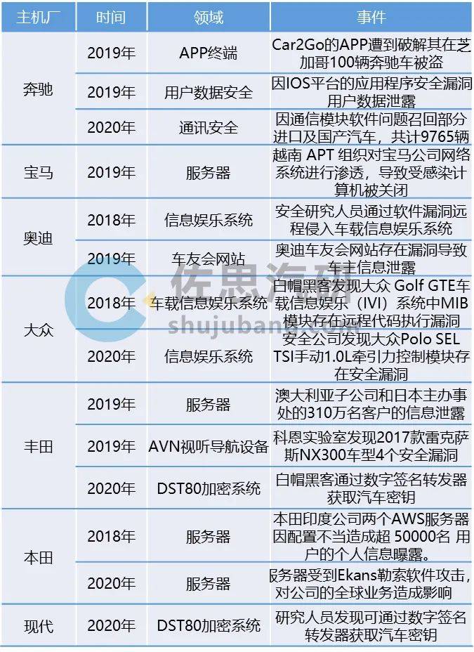 来源:upstream.auto;佐思汽研整理 不同品牌汽车正在遭受不同程度安全攻击 车辆智能化程度越高,所遭受的安全攻击越多。在智能化背景下,全球主机厂无一幸免,例如奔驰、宝马、奥迪、大众、丰田、本田、现代等国际一线品牌,均遭受了不同程度的安全攻击。 图:2018-2020年部分主机厂信息安全事件