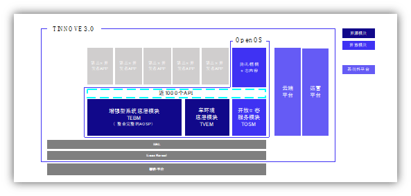 2012年安卓手机型号数量 任何一个成功的智能操作系统,都离不开庞大的软件资源支撑。这要求系统和硬件完美协同。型号众多、版本各异的安卓系统,给安卓平台的软件开发带来了不小的挑战,软件与设备的兼容性也可能出现问题。 这些问题的最终结果,就是开发商开发成本提升,终端用户面临软件卡顿、闪退等问题。在手机端,这些问题只是无伤大雅的瑕疵,但一旦上升到对安全有极高要求的车端,这些问题轻则让车辆抛锚,重则导致车毁人亡。 安卓的碎片性,同样困扰着车联网行业。从产品种类看,主流汽车产品的型号数量比主流手机型号更加丰富。此外,随着车联网行业的纵向扩张趋势,车联网系统也由单纯的影音娱乐系统,向车身控制、运动控制以及自动驾驶等方向延伸,安卓系统的碎片化问题将严重阻碍车联网的向前发展。 为了保证安全性,提升汽车软件的适配性,定制化安卓车联系统仍然是车联网品牌为数不多的选择。因此,车联网行业各参与方们投入巨资,开启安卓系统个性化改造工作。例如,阿里推出了AliOS、百度推出小度车载OS、比亚迪推出DiLink、蔚来推出NIO OS、小鹏推出Xmart OS等。 这些系统自身表现优良,但本质而言,各个车联网品牌仍然停留在「重复造轮子」的阶段。系统之间各自为战,也加剧了第三方开发者们的工作量。整个车联网行业,都在渴望一个更开放的新系统。 开源技术底座,能否推动车联网走向开放? 不难看出,当下的车联网行业,需要一款真正开放的“技术底座”,既能针对不同的车型,为汽车产品提供标准化解决方案,又具备多场景应用生态,可以为行业提供丰富的可兼容性软件工具,让汽车操作系统既能深度适应车辆硬件,又可以为智能化汽车提供海量应用生态。 在这一背景下,腾讯旗下车联网企业梧桐车联,日前发布了面向全行业开源的车载操作系统“技术底座”TINNOVE OpenOS,以及配套的整合解决方案TINNOVE 3.0。其技术细节,也在近期曝光。 其中,TINNOVE OpenOS车载操作系统专门针对安卓系统适配体验差,重复投入问题而开发,包含增强型系统底层模块TEBM、车环境底层模块TVEM、开放生态服务模块TOSM三大模块。 该系统内含完整的安卓标准AOSP,贯穿整车音频策略、车控信号、方向盘控件、空气控制系统和电源管理全流程。此外,系统还在开放生态中提供了算法引擎、开发、框架、运营等4个种类的服务工具和几百个开放接口,共同构成了这一开源、专为车环境打造的操作系统技术底座,并使得多车型系统开发拥有统一的标准,摆脱告别各自为营的局面。