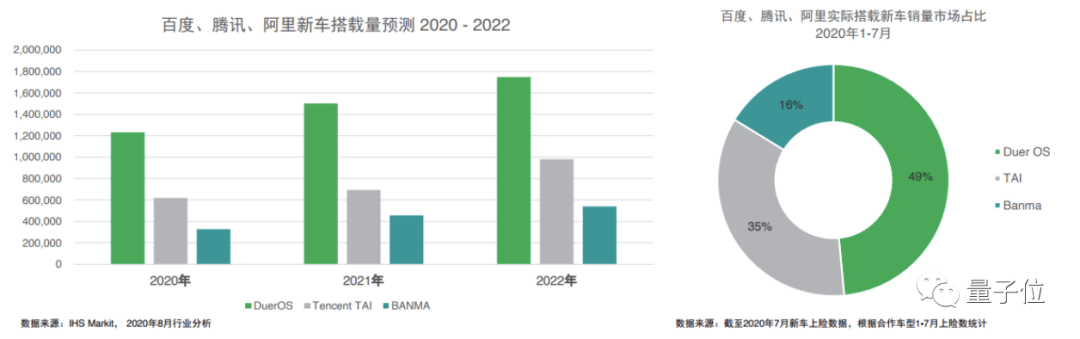 显而易见的是,无论是从技术上还是从效率上,传统车企在这个过程中受限于传统业务模式和产品研发模式,要独立完成汽车智能化的发展,无异于重复造轮子,颇有些吃力不讨好。 于是,在当下这个时间点,百度、阿里、腾讯这样的互联网企业,愈发展现出技术积累的平台优势。 IHS Markit发布的《中国智能网联市场发展趋势报告》就指出,目前“以BAT为代表的互联网科技公司,成为智能网联平台的重要服务供应商”。 数据显示,今年1-7月,百度实际搭载新车销量市场占比达49%;腾讯占比达35%;阿里占比16%。 报告预计,未来3年将会有越来越多车企和BAT这样的科技巨头进行合作,共同研发适应中国市场特色的智能网联生态。未来3年搭载BAT智能网联服务的新车数据量,将实现15%左右的年均复合增长率。