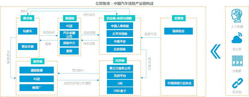 但对于保险中介而言,在车险综改的影响下,目前车险市场除了存在因自主系数不一,各家保险公司渠道营销策略不一致的混乱局面外,车险手续费下降将使其利润空间缩小,保险中介通过手续费率信息不对称赚取差价的经营方式变得愈加困难。 另外一面,对于保险公司而言,车险综改以后,更为自主的定价方式考验着保险公司的风控能力,其此前主要靠高费用吸引中介带客户的手段也将失效,所以,未来如何更为有效的获客也将考验着大部分保险公司。 02科技创新服务赋能 当下,人工智能、云计算、大数据、区块链等技术正在逐渐加速对车险市场渗透,车险服务体系中各个环节的效率及服务体验正在日益提升。 亿欧智库判断,在此时间节点下,三大主体公司将逐渐开展围绕以科技手段赋能车险业务的整体布局。届时,科技公司的技术赋能将成为助推车险产业继续发展的重要抓手,围绕其布局的企业也将逐渐增多,产业商机也将逐渐显现。