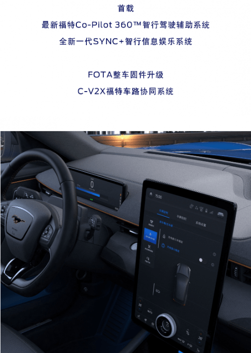 这款车自在北美发售以来,就被媒体称为 在福特中国发布的官图中,我们注意到全新一代福特Co-Pilot360?智行驾驶辅助系统与SYNC+智行信息娱乐系统都将在国产Mustang Mach-E上首发,同时支持FOTA固件在线升级。看样子,福特是想把Mustang Mach-E打造成一款具有智能内核的纯电动车,在国内新能源市场与一直以智能科技领先的特斯拉一决高下。