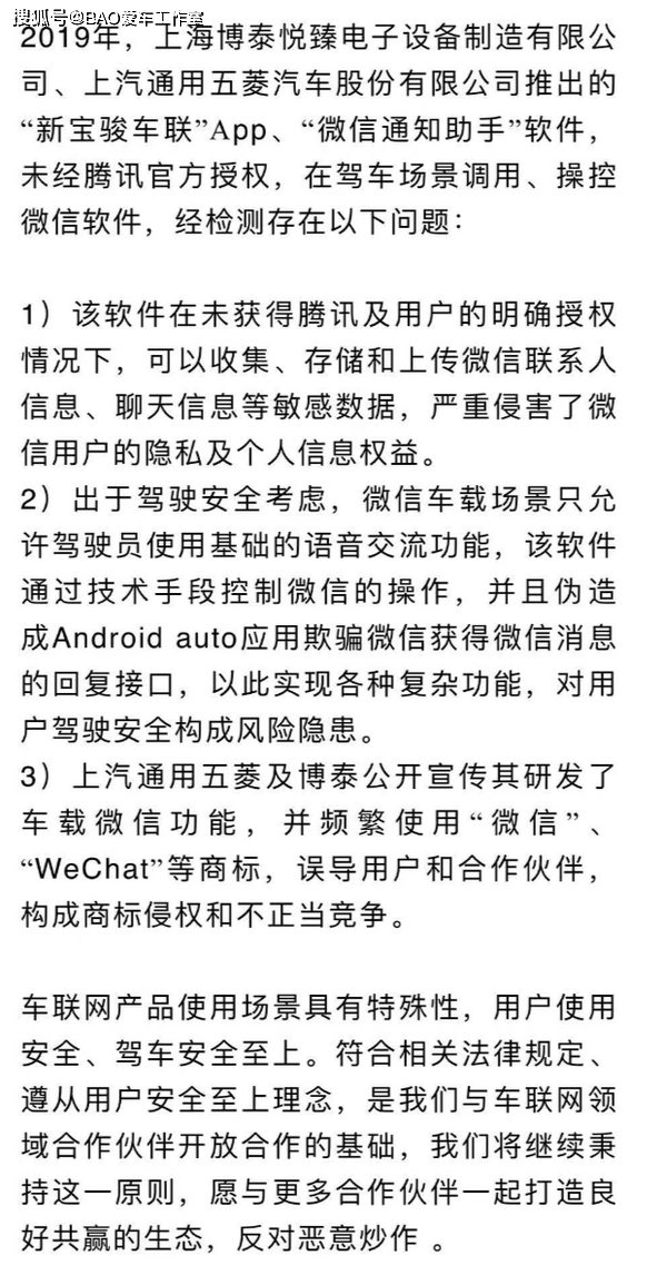 今日有媒体报道,博泰和上汽五菱联合提交“反垄断举报书”,指向腾讯垄断。腾讯也随后给出了回应,表示博泰侵权在先,“恶意炒作垄断”不应当成为侵权的挡箭牌。 近日,汽车界和互联网界这两个原本看似关联不大的产业,也扯上了“反垄断”的名头,是什么让看似遥远的两个产业纠缠在了一起?核心的争议点,是车载微信。 现在很多人都存在开车不能查看消息的焦虑心理,拿起手机收发消息,也存在很大的安全隐患。腾讯在2018年推出了微信车载版,和手机版的微信不同,微信限定车载版是通过全语音交互的方式,来保障驾驶安全,避免分心,保持最大克制。 微信属于腾讯,这又和博泰车联网有什么关系呢?事情可以追溯到两年前。 实际上,博泰也是一家车联网公司,2019年,博泰发布了一款叫做“微信通知助手”的软件,宣称实现车上使用微信功能。但腾讯官方认为,这个微信功能,和腾讯官方推出的微信车载版是完全不同的两个产品,也没有获得腾讯官方的授权许可。 随后,上汽通用五菱和博泰合作的多款新宝骏汽车,在宣传时都主打微信为卖点,宣称是“首个把微信语音功能带入汽车”,强调“开车抢红包”这一所谓功能卖点,而这些需要用户复杂操作、分散开车精力的危险功能,在腾讯官方出品的微信车载版中并不存在。此前腾讯在公开场合表述,微信在车联网上的应用,只保留了必要的通讯功能,而且通过全语音或者方向盘按键操作,就是为了用户车上使用安全考虑。 基于博泰开发产品存在的安全隐患,以及对微信等商标侵权行为,腾讯表示曾发送律师函要求对方终止不正当竞争行为,无果只能向法院提起诉讼。于是,博泰举起了“反垄断”大旗。 对此,腾讯官方回应,给出了明确答复: