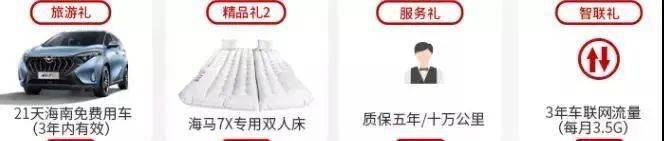 豪礼1:自在旅游 购车即享21天海南免费用车权 豪礼2:舒适车居 购车即得海马7X专属双人床 豪礼3:周到服务 五年质保/十万公里享全方位保养 豪礼4:智联流量 3年充足车联网流量 体验车内任性刷剧的快感 最后关注京东海马汽车官方旗舰店 更多购车惊喜等你来解锁! |