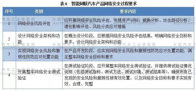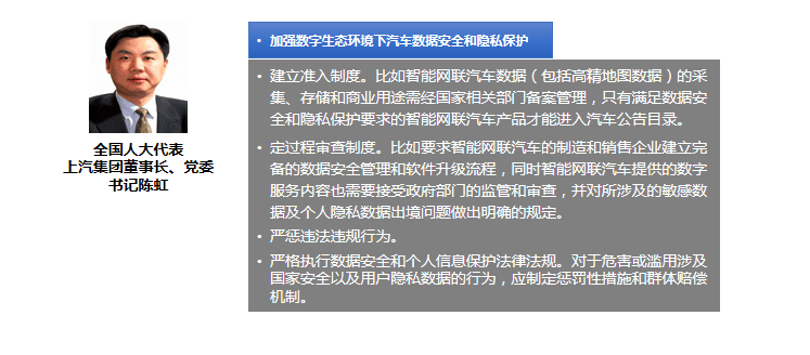 3. 网络安全过程保障要求 《准入管理指南》在概念设计阶段、产品开发阶段和测试验证阶段均提出了网络安全保障要求。为了确保智能网联汽车的网络安全, 在测试验证阶段,汽车企业必须开展整车网络安全测试验证,并提供测试验证情况说明(包括测试指标、测试方法、测试环境、测试结果等),确保所有已发现的安全风险和脆弱性被有效处置,以及网络安全目标和要求实现有效、合理、完整。 今年两会期间,多个汽车行业提案指向智能网联汽车信息安全,我国在信息安全领域的急需建立相应的法律和法规体系和准入制度。