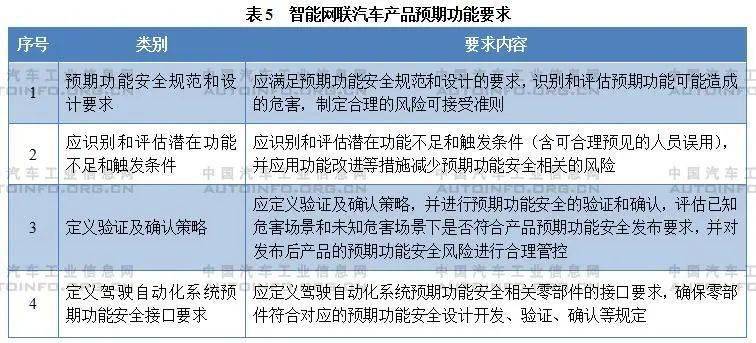 四 产品准入:智能网联汽车产品应明确自动化功能及设计运行条件 智能网联汽车产品准入过程保障要求包括整车尤其是驾驶自动化系统的功能安全过程保障要求、驾驶自动化系统预期功能安全过程保障要求和网络安全过程保障要求三大类。 1. 功能安全保障要求 企业要进行完整的整车功能安全集成测试。《准入管理指南》提出应进行功能安全集成测试,通过基于需求的测试、故障注入测试等方法,确保对整车和驾驶自动化系统的相关要求得到实施和满足。需特别指出,功能安全集成测试除了在封闭测试场进行外,还必须在各种道路场景进行测试验证,这样才能达到整车功能安全的必要要求。