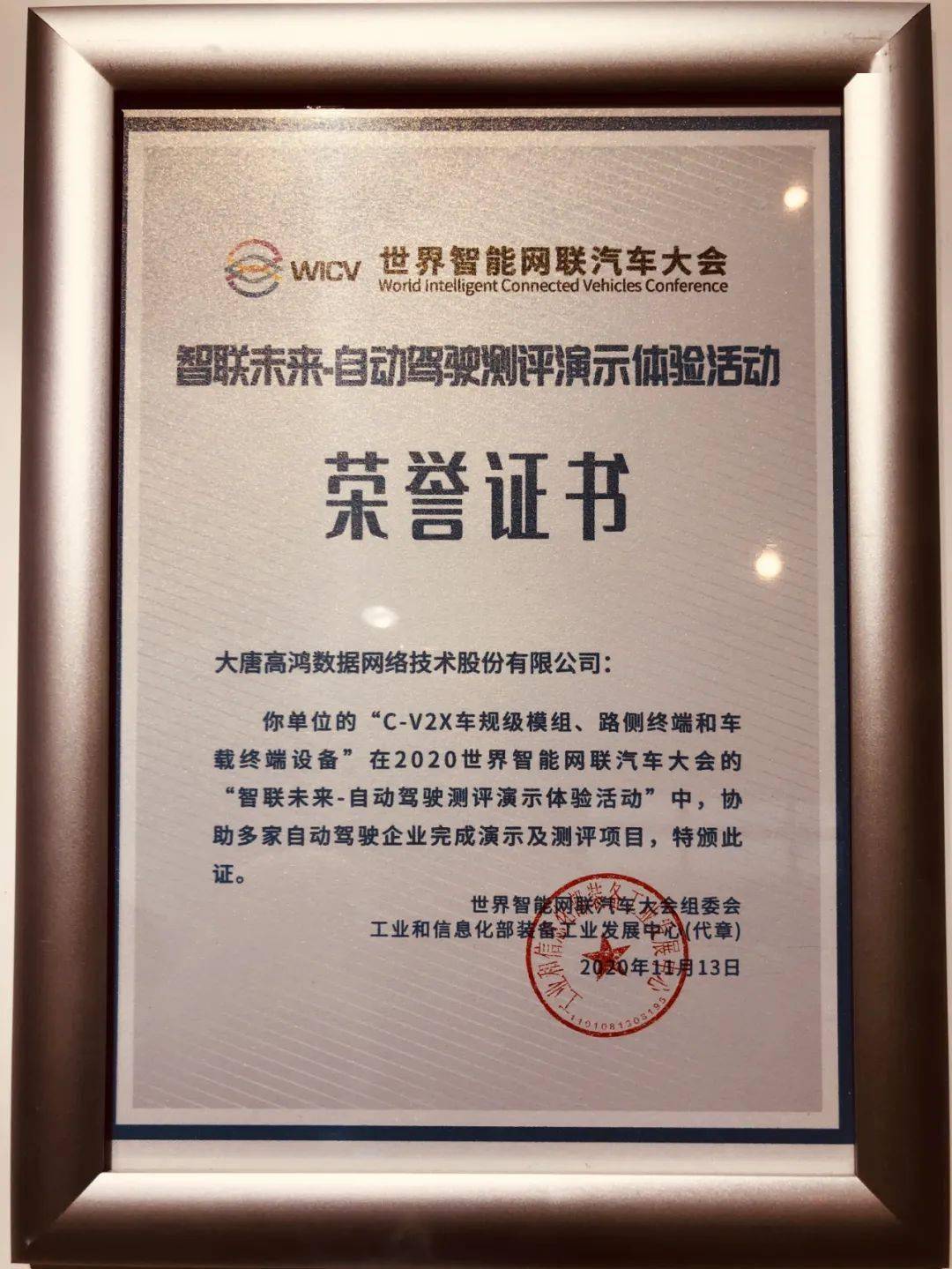 △现场自动驾驶测试 凭借稳定可靠的C-V2X产品及成熟的技术方案,大唐高鸿为自动驾驶演示及测评项目提供的全程保障服务,得到了合作伙伴的高度赞誉,并获得组委会和工信部装备司的表扬和肯定。