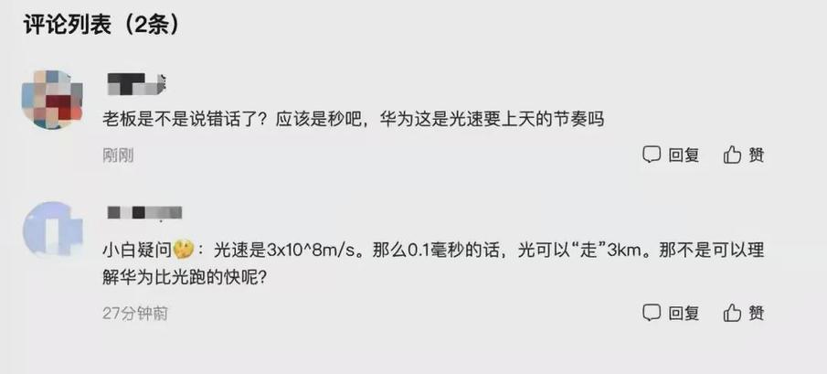 因为华为在博鳌上的这一番言论,让网友们重拾中学物理知识。有网友提到,“这意味着华为的信号载体速度高达2000万公里/秒,这个速度已经远远超过了光速,恭喜华为成功突破物理学限制,让爱因斯坦、普朗克、霍金自愧不如”。