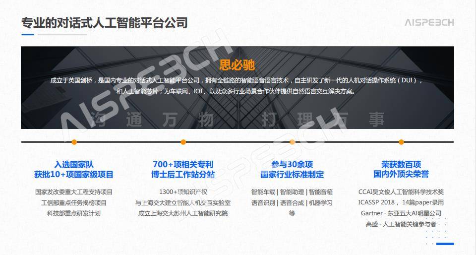 最后简单介绍一下思必驰,思必驰是国内领先的对话式人工智能平台公司,拥有全链路的智能语音语言技术,自主研发了新一代的人机交互平台(DUI),和人工智能芯片(TH1520);为车联网、IoT、以及众多行业场景合作伙伴提供自然语言交互解决方案,同时不断丰富后端服务资源,满足用户的多样化需求。 这是合作客户方面,思必驰携手众多合作伙伴如长城汽车、理想汽车、北汽集团、一汽奔腾、上汽通用五菱、东风日产、爱驰汽车、天际汽车、马自达、五十铃、吉利汽车、一汽解放、三一重工、上汽大通等,打造了小鹏P5/P7/G3、宏光MINIEV、岚图FREE、荣威