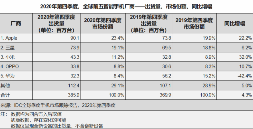 基于以上公开信息,分析人士判断,OPPO似乎将以零部件供应商的身份切入造车赛道,芯片、软件、供应链环节,车联网、车载通讯、车用传感器等都是其机会点。 以目前OPPO在车辆相关应用的发展,主要还是将旗下VOOC闪充技术带到车上使用,借此让手机充电效率提升。而从目前OPPO提及技术专利项目来看,多半还是从手机技术移转而来,若要应用在车辆上,还需要进一步精进。 有汽车业人士表示,对于手机业者而言,造车是一个品类的升级,需要的技术可能远高于手机。加上造车伴随着资本高投入与较长的回报周期,对于手机公司而言等于是二次创业。 调研机构IDC的数据显示,OPPO在2020年第四季度是全球手机出货量排名第四位的手机厂商,前三名分别是三星、苹果和小米。