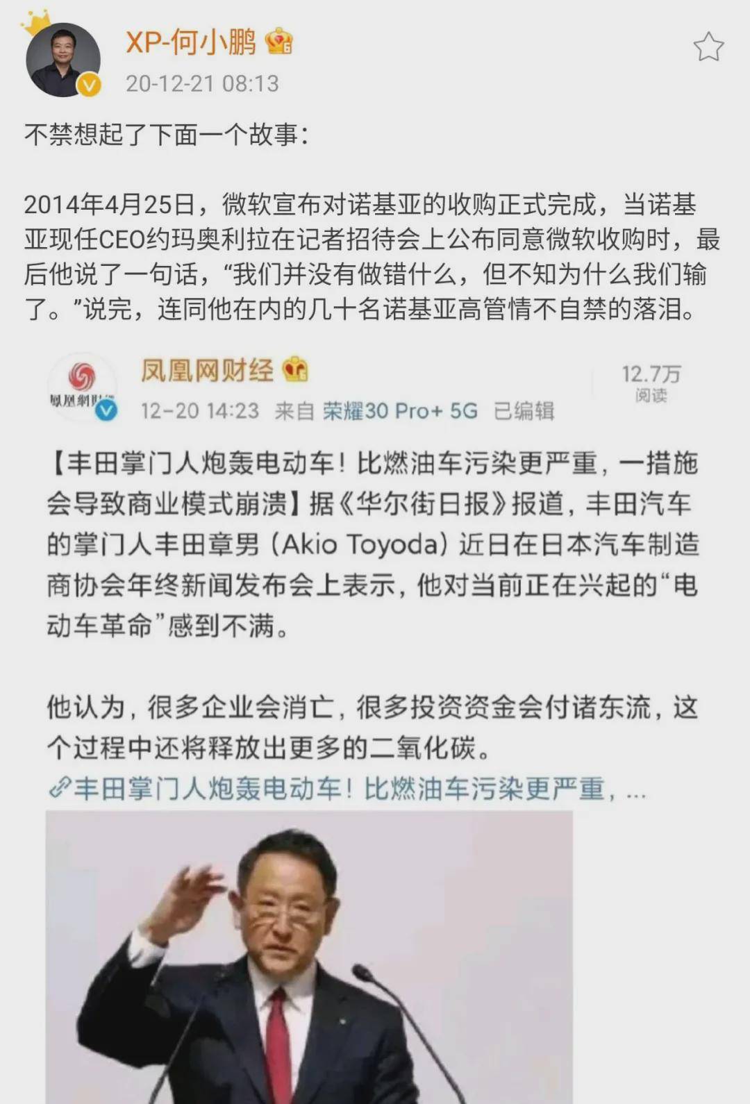 他认为电动车被过渡炒作,电动车不但并不环保,而且电动车需求越大,二氧化碳将排放的越多。并且如果政府禁售燃油车,还将导致日本汽车行业的商业模式大崩溃,造成数百万人失业。 说实话,丰田章男这番话并不错,目前看来电动车的问题确实很多,但他却忽视了电动车正在快速进步和迭代。而如果等到电动车彻底成熟之后再入场,那只能是啥都赶不上了。 对丰田章男这番话,何小鹏更是暗讽其可能就是下一个诺基亚。丰田会不会变成下一个诺基亚我不敢说,但丰田目前面临的形势和当年的诺基亚却有几分相似,上一个时代的霸主在颠覆性的变革面前迟疑又彷徨。