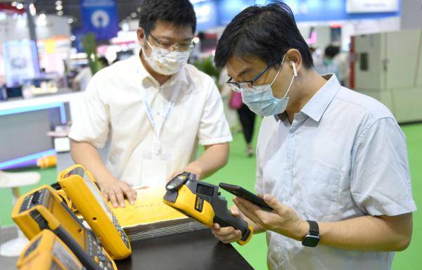 ↑5月25日,客商在2021广州国际汽车技术展览会上参观了解电子测试测量仪器。