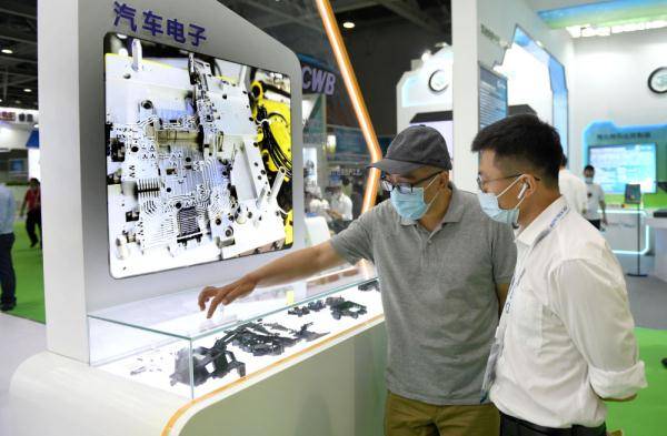 ↑5月25日,客商在2021广州国际汽车技术展览会上参观了解汽车电子产品。