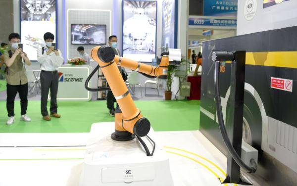 ↑5月25日,客商在2021广州国际汽车技术展览会上观看一台汽车充电机器人演示自动充电。 |
