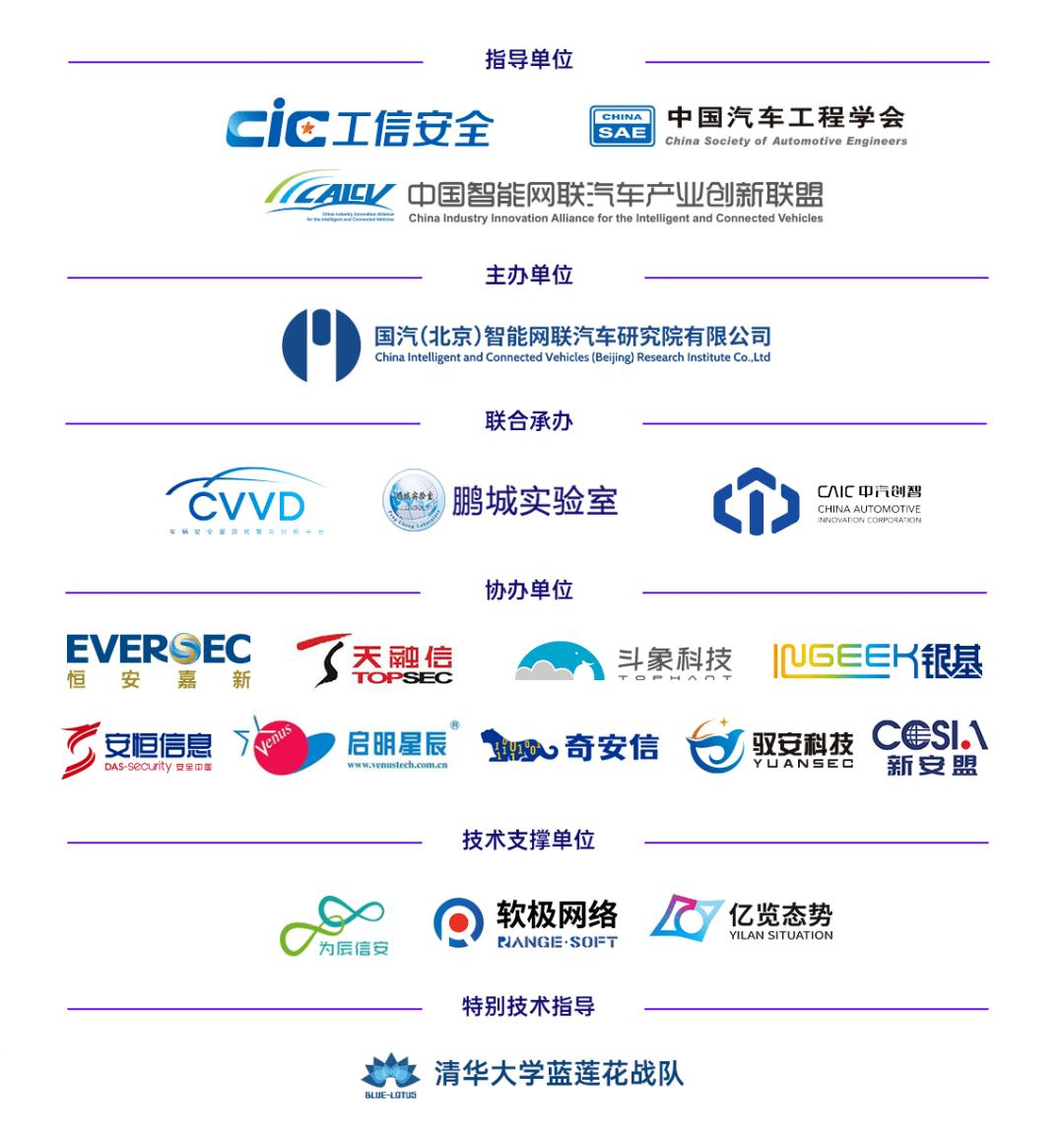 国家工业信息安全发展研究中心 中汽创智信息安全首席技术官 孙军 胡红星 大赛聚焦于汽车信息安全专业领域,吸引了来自全国各地的主机厂、零部件厂、安全厂商、高校及科研机构等300多位精英人才参与。裁判组阵容强大,邀请到了国家工业信息安全中心、百度、银基安全等行业顶级专家对大赛进行指导。此外,清华大学教授&“蓝莲花战队”联合创始人诸葛建伟作为特别技术指导出席了本次大赛。