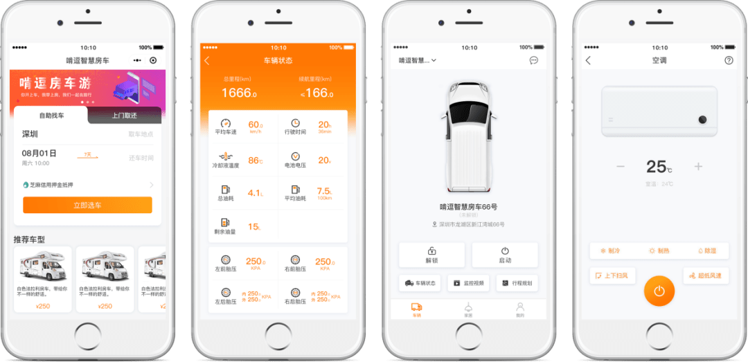 在房控方面,针对目前市场上房控产品兼容性和扩展性差、需定制且难维护等痛点,智能房车监控系统RVC的采用全球首款可编程房车专用控制器,兼容市面上99%以上的水、电、空气、环境监测传感器、生活电器等,满足前装及后装需求,可编程房车专用控制器可扩展接入任意多种类型传感器并与原系统融合,实现安全、智能化逻辑控制。 多功能一站式服务让房车租赁及使用更简单在车辆租赁方面,啃逗智慧房车APP以IIFAA认证的具有金融级别安全的数字车钥匙作为核心,整合在线一站式服务,既可以通过房车租赁平台实现一键订车、房车营地查找预定、路线规划等,也可通过手机APP及系统后台实现轨迹查询、导航找车、视频监控、车辆状态数据采集、车辆智能控制、家居智能控制等功能。