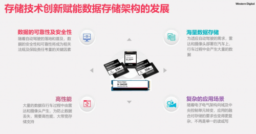 图 西部数据中国区嵌入式产品销售部门销售总监文芳女士 行业变化推动数据存储新发展 如今,在提到数据或者信息交互的时候,很多人第一印象就会想到“云端处理”。但随着技术的发展,我们可以看到对于不同类型的数据,需要采用不一样的存储介质和设备,既要满足存储数据的海量需求,还要满足对数据进行快速处理的需求,简单来说,虽然云是分析数据用以改进算法和数据库的重要部分和手段,但它不足以满足实时边缘计算的需求,本地存储就显得很重要。 在汽车行业,智能驾驶和自动驾驶的飞速发展,越来越多的OEM,一级供应商以及科技公司都将研发重点放在自动驾驶、ADAS、SaaS等领域。举例来说,百度、华为、阿里和小米为首的高科技公司;超星未来、奥特贝睿和宏景智驾等专注于私家车高阶自动驾驶研发的新型Tier1;自动驾驶车队如小马智行、文远知行、AutoX、赢彻科技和主线科技等引领L4自动驾驶商业化落地;纯电动车起家的蔚来、小鹏和理想等造车新势力,这些新的公司和研究机构的加入,为汽车领域尤其是为推进汽车新四化的发展起到了巨大的推动作用。 “随着汽车智能网联的不断推进,汽车的电子电气架构(E/E)也在随之变化,从最初的分布式在向域融合和中央控制单元过度。虽然新的电子电气架构目前还没有统一的标准,但是对于存储产品的要求却是发生了很多变化。数据稳定性和安全性,大数据存储,性能提升,更加复杂的应用需求,等对车内及边和云的数据存储提出了更高的要求,为了实现完全自动驾驶,不仅需要单车智能,车路协同同样必不可少,”西部数据资深产品市场经理额日特先生在AUTO TECH 2021展会发表题为《数据存储及架构 赋能汽车领域创新》的演讲时提到,“端-边-云数据基础架构能够确保汽车行驶过程中数据计算的时效性,减少因中心云计算高延迟带来的潜在的风险。”