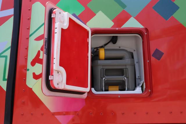 在解放JH6+的车外有一个“灰箱子”,这是一个黑水箱,它连接着马桶,里面的工具必要本身处置,别的,车内还有一个小型冰箱,可以冷冻一些饮品和冰糕之类的降暑物。