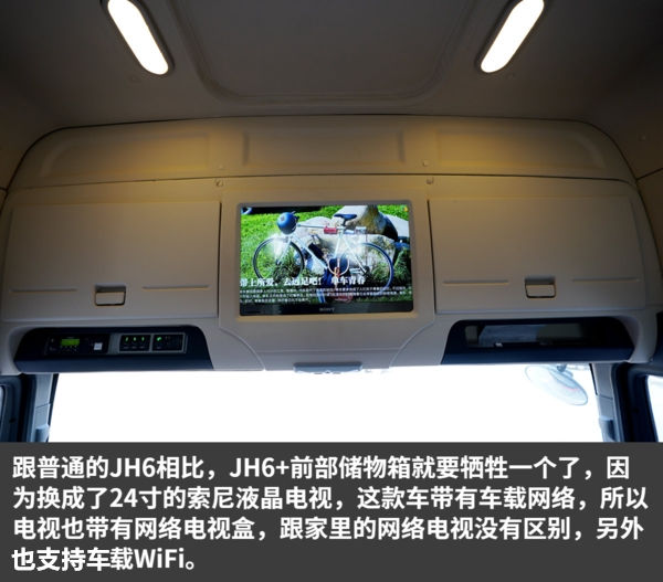 在解放JH6+的车顶有一个24寸的索尼网络电视,通过车内的车联网系统可以联网旁观视频,另外,床头柜里还有两个抽屉,可以寄存一些糊口用品。它的折叠桌还集成为了电磁炉功能,可以做饭。