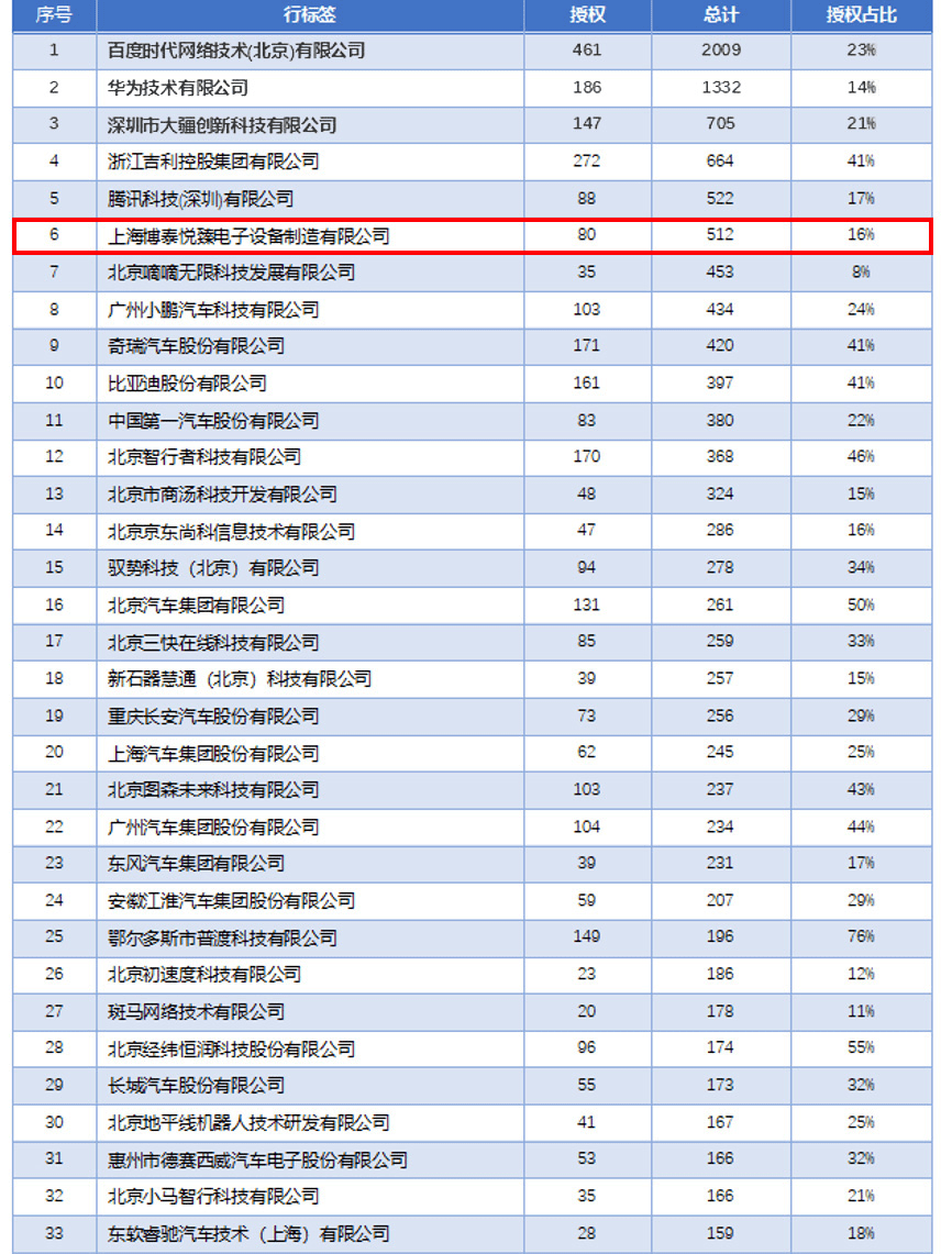 图1:2021年中国自动驾驶专利排行榜TOP10 根据智慧芽的数据统计显示,截至2020年6月,我国有8,275家公司参与了自动驾驶专利申请,专利合计40,682件,其中授权专利14,018件。博泰累计申请专利512件,排名第六,在车联网产品和服务提供商中排名第一,同时也是TOP10中唯一一家车联网产品和服务提供商。