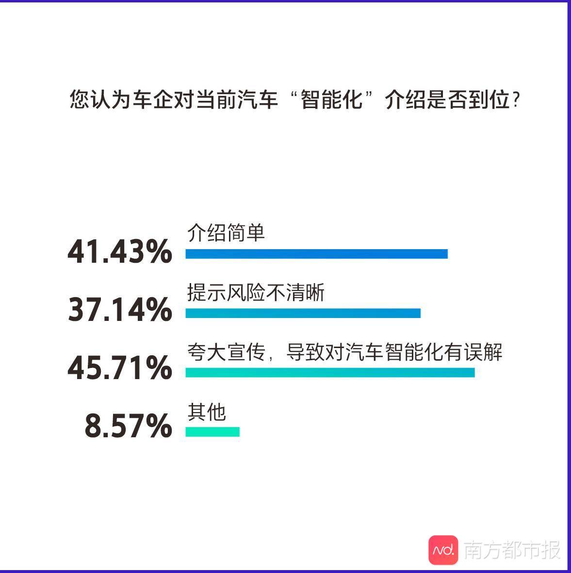 此次调查数据显示,在了解到当下智能汽车功能存在不少局限性以后,有接近50%的消费者认为智能汽车车企对产品的“智能化”存在夸大宣传。 “单看车企的宣传页和宣传视频,很容易觉得它们的自动驾驶已经做到很牛的水平,但其实有些是还在测试中的技术。”一位车主在调查问卷中表示,“或者是同样的车,但宣传时都是在特定有利的条件下运行,而没有说其实有很多局限。” 调查数据显示,不认为车企对产品“智能化”介绍不到位的车主只占到8.57%,而自认为对于自动辅助驾驶功能的局限性了解程度在“一般”以下的车主占比超过5成。整体来看,车主对于车企在智能化功能安全性的介绍上仍存在较大不满,这也是智能汽车车企亟需提升的方面。 相对于不了解智能化功能局限性带来的误操作风险,车主更直接的担忧则是这些智能功能本身是否会导致安全风险。