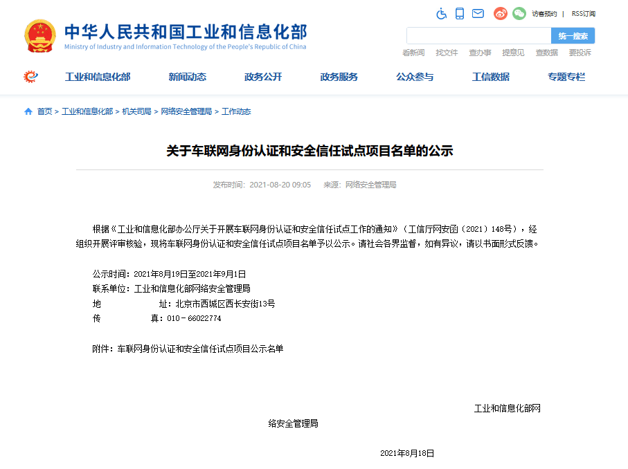 为贯彻落实《新能源汽车产业发展规划(2021-2035年)》《车联网(智能网联汽车)产业发展行动计划》,加快推进车联网网络安全保障能力建设,验证车联网电子认证技术,推动建立统一身份权限认证管理能力,工业和信息化部组织开展车联网电子认证与安全通信试点工作。 8月20日,工业和信息化部网络安全管理局公布了车联网身份认证和安全信任试点项目认定结果的通知。长春吉大正元信息技术股份有限公司(以下简称:吉大正元 股票代码:003029)成功入围工信部车联网身份认证和安全信任试点项目单位。