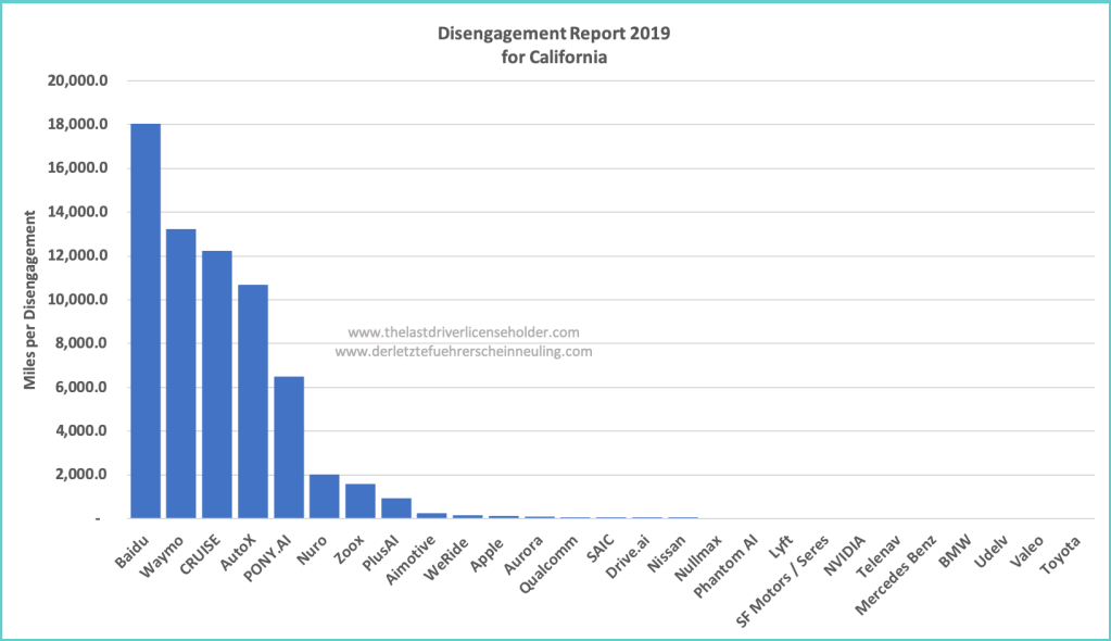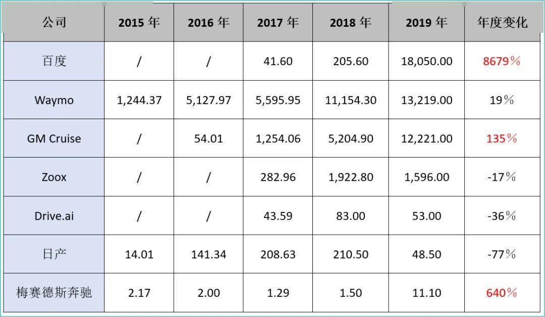 图1:加州机动车辆管理局统计的自动驾驶公司自主报告的安全员干预情况表,2019(来源:https://thelastdriverlicenseholder.com/2020/02/26/disengagement-report-2019/) 除平均干预里程间隔外,另一个引人注目的变化是:需要安全员干预的里程变化速度。从国外媒体梳理出的加州机动车辆管理局统计的历年安全员干预情况表看,2018年-2019年, 有些自动驾驶公司的干预里程变化速度出现惊人的变化,但这些数据也引发一些专业人员对真实性的质疑(图2)。