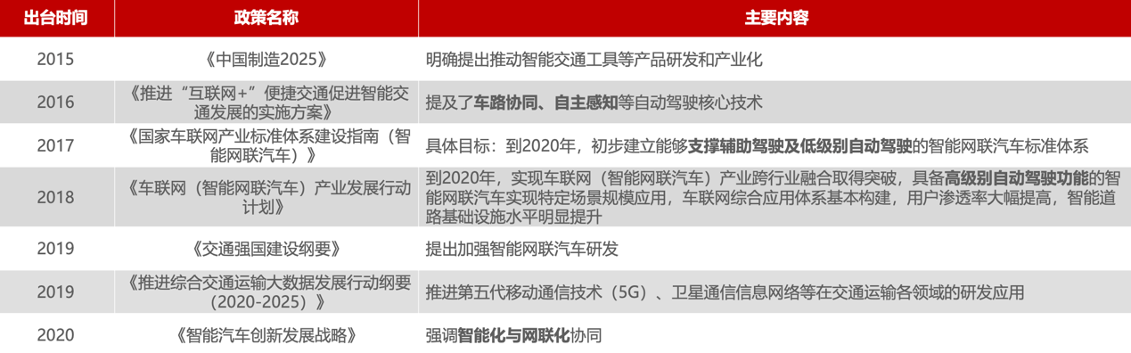 国家政策方面,自2015年至今,我国先后推出多项与智能网联汽车相关的重点政策。2015年,国务院出台《中国制造2025》,该文件是中国实施制造强国战略的第一个十年行动纲领,明确提出推动智能交通工具等产品研发和产业化;2017年工业和信息化部国家标准化管理委员会印发的《国家车联网产业标准体系建设指南(智能网联汽车)》设定了具体目标,即到2020年,初步建立能够支撑辅助驾驶及低级别自动驾驶的智能网联汽车标准体系;2018年工业和信息化部印发《车联网(智能网联汽车)产业发展行动计划》提到,到2020年,实现车联网(智能网联汽车)产业跨行业融合取得突破,具备高级别自动驾驶功能的智能网联汽车实现特定场景规模应用,车联网综合应用体系基本构建,用户渗透率大幅提高,智能道路基础设施水平明显提升;2020年国家发改委等11部委联合印发《智能汽车创新发展战略》强调智能化与网联化协同。基于以上,国家政策的出台加大了对智能网联汽车的扶持力度,各地积极响应 建设智能网联示范基地,目前全国已有超过30个测试示范区,为车联网推广保驾护航。