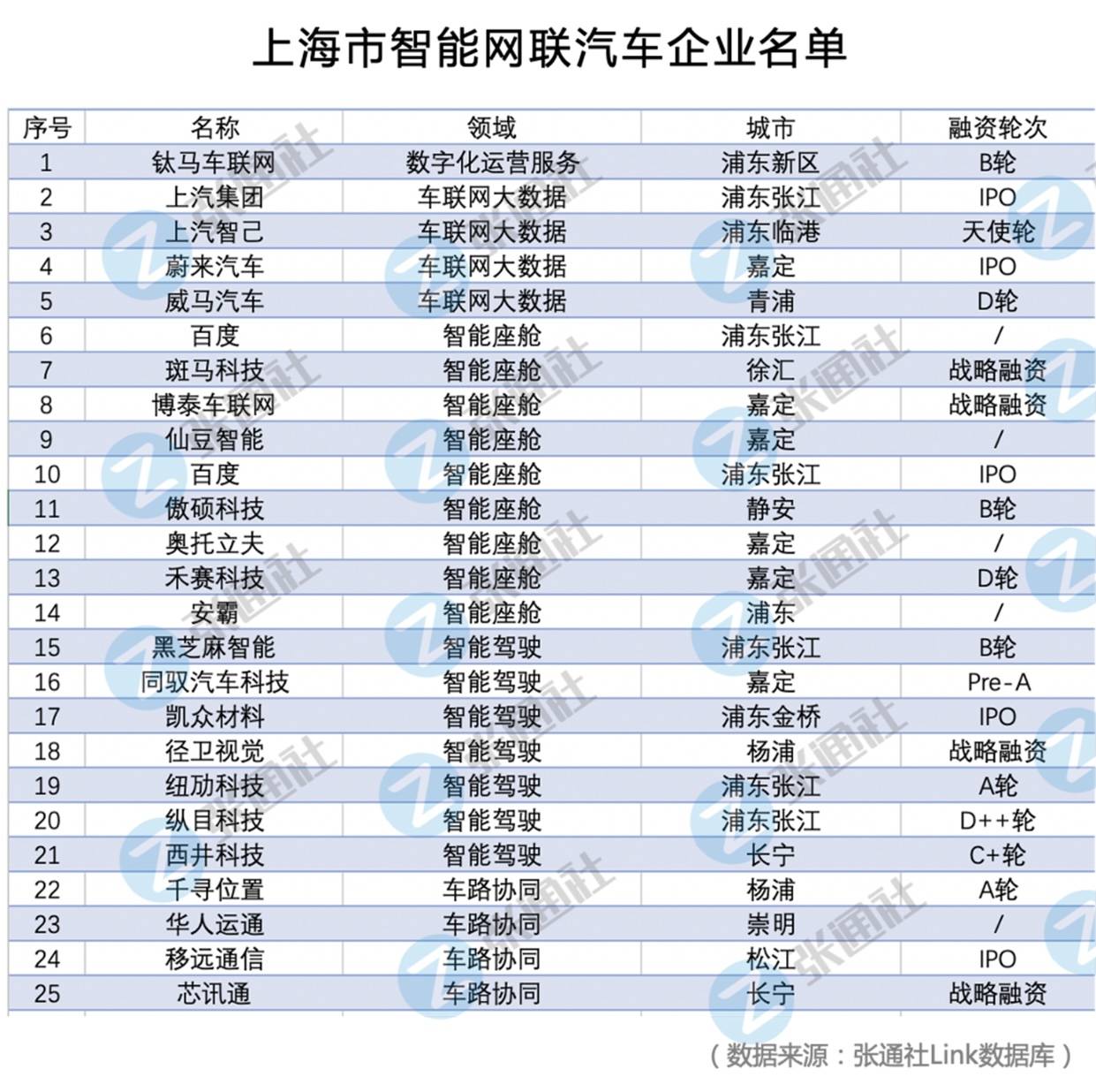 行业发展方面,前文中已有提到,目前在智能网联汽车领域已经形成两股势力,一股是传统车企加造车新势力的渐进式打造,这一方以大众、通用、蔚来、小鹏等为代表;另一种是科技巨头的跨越式入局,以华为、百度、阿里等为代表。目前在智能网联汽车领域特斯拉走在引领地位,今年特斯拉已经实现L4级别的自动驾驶。 上海智能车联网企业布局目前,智能网联汽车产业可划分为数字化运营服务、车联网大数据、智能座舱、智能驾驶、车路协同等几个领域。根据张通社Link数据库,在智能网联汽车产业中有超120家企业从事相关赛道的产品研发。其中大多数企业分布在北京和广东两个省份,上海企业共有25家(详见以下表格)。