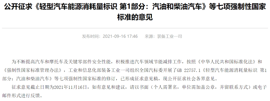 9月17日,工业和信息化部装备工业一司公布“公开征求《轻型汽车能源消耗量标识 第1部分:汽油和柴油汽车》等七项强制性国家标准的意见”。 意见称,为不断提高汽车和摩托车及关键零部件安全性能,促进汽车领域节能减排工作发展。按照《中华人民共和国标准化法》和《强制性国家标准管理办法》,工业和信息化部装备工业一司组织全国汽标委开展了GB 22757.1《轻型汽车能源消耗量标识 第1部分:汽油和柴油汽车》等七项强制性国家标准的修订,已形成征求意见稿,现公开征求社会各界意见。征求意见截止日期为2021年11月16日。 汽车生产企业应重点关注附件1至附件4,其余附件略。 《GB 22757.1《 轻型汽车能源消耗量标识 第1部分:汽油和柴油汽车》(征求意见稿)》规定了轻型汽车能源消耗量标识的内容、格式、材质和粘贴要求。适用于能够燃用汽油或柴油燃料的、最大设计总质量不超过3 500kg的M1、M2和N1类车辆,不适用于可外接充电式混合动力电动汽车、纯电动汽车及仅可燃用其他单一燃料的车辆。 GB 22757.2 《轻型汽车能源消耗量标识 第2部分:可外接充电式混合动力电动汽车和纯电动汽车》(征求意见稿)规定了汽车能源消耗量标识的内容、格式、材质和粘贴要求。仅适用于最大设计总质量不超过3 500kg的M1、M2类和N1类的可外接充电式混合动力电动汽车和纯电动汽车。 汽车能耗标识标准是汽车节能标准和管理体系中必不可少的重要环节,也是国家进行汽车产品节能管理的重要技术依据。我国《轻型汽车燃料消耗量标识》标准于2008年正式发布实施以来,配合《轻型汽车燃料消耗量标示管理规定》等相关政策,在引导消费者购买低油耗节能车辆、促进车辆保有结构向高效节能车辆转变方面发挥了十分积极的作用。该标准于2017年进行了第一次修订,修订后的《轻型汽车能源消耗量标识》将混合动力汽车、纯电动汽车纳入标识范畴作为标识标准的一部分,进一步完善了我国的汽车节能管理体系。但是,现有标识也存在标识信息及展示方式无法准确反映实际能耗,标识能耗与实际能耗存在差异导致消费者抱怨的问题。同时,目前我国轻型汽车能耗、排放测试领域正在由NEDC工况向WLTC工况、中国工况切换。新发布的国Ⅵ排放标准采用WLTC工况,下一阶段能耗标准也将导入WLTC工况和中国工况。针对上述问题,亟需对现行标识进行修订。 (来源:工业和信息化部装备工业一司) 2021中国汽车经销商集团百强排行榜发布 协会发布 | 二手车周度快报(2021年5月17日-5月20日) 协会发布 | 车市扫描 周度分析(2021年5月17日-5月23日) 党建工作 | 中国汽车流通协会党支部赴西柏坡参观学习 |