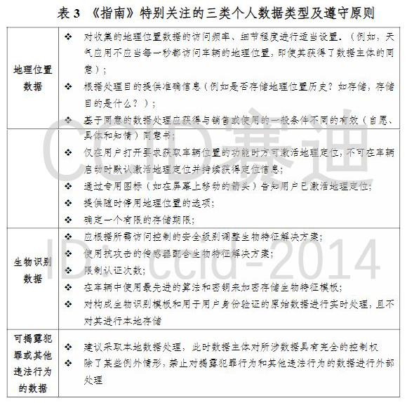 二 《指南》特点分析 与上位法进行了衔接匹配。《指南》分析了车联网语境下欧盟《通用数据保护条例》(下称“GDPR”)和《电子隐私指令》的适用情况,并指出了网联汽车的信息处理能力及工作特性已经符合法律中关于“终端设备”的定义,即“直接或间接与一个公共网络的接口相连接,进而发送、处理或接收信息的设备”,网联汽车应被视为与手机、电脑、智能电视一样的终端设备。 首次界定了网联汽车个人数据的边界。网联汽车涉及汽车、个人、路况、媒体娱乐等多类数据,《指南》首次对网联汽车个人数据的边界进行了界定,明确其关注的数据是通过车辆传感器、车载T-box、手机应用等方式收集的,与自然人直接或间接相关的数据。