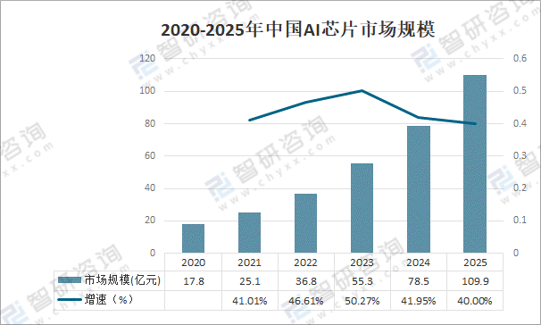资料来源:智研咨询整理 2020年,中国AI芯片市场规模达到17.8亿元,随着汽车EE架构加速升级,域控制器/中央计算平台被广泛使用,预计到2025年AI芯片市场规模达109.9亿元;全球汽车芯片短缺情况愈演愈烈,正在倒逼中国芯片产业做大做强。近些年,中国汽车芯片厂商逐渐掌握话语权,并在高性能芯片上取得重要突破。为车联网的发展提供了重要的技术支撑。 2020-2025年中国AI芯片市场规模