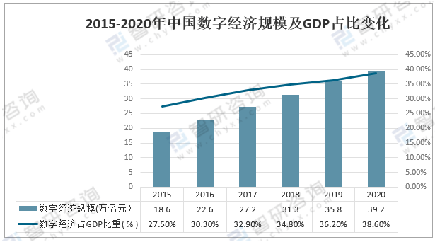 2015-2020年中国数字经济规模及GDP占比变化