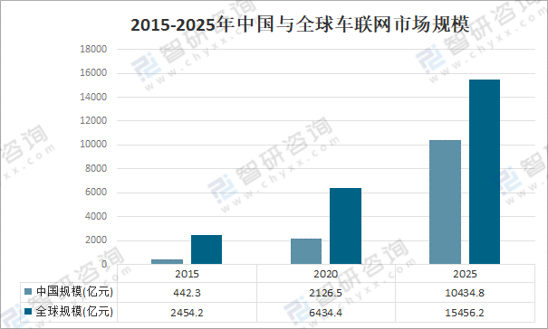 资料来源:公开资料整理 智研咨询发布的《2022-2028年中国车联网行业市场运行格局及发展策略分析报告》数据显示:2020年中国车联网行业规模达2126.5亿元,随着多项支持政策密集推出,国家战略规划成为车联网发展的重要推动力,车联网产业借着"政策东风”在各类应用场景中加速布局,预计2025年中国车联网市场规模将达到万亿元。 2015-2025年中国与全球车联网市场规模