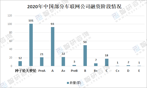 资料来源:公开资料整理 2020年, 处在天使轮的车联网企业最多,其次是A轮和B轮,融资良莠不齐。预计 2021年将会有更多。车联网初创企业获得融资,经过时间和市场考证,B轮企业最具潜力价值。从融资轮次的角度看,大部分集中在A轮和B轮,只有1家公司的融资事件为E轮。虽然融资轮次未出现明显后移,但是A轮、B轮的比重逐渐增加,预示着市场由萌芽期逐步转向快速扩张阶段。 2020年中国部分车联网公司融资阶段情况
