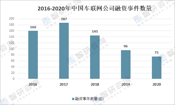 资料来源:公开资料整理 数据显示,2017年是中国车联网相关企业融资最为密集的时期。产业开始走向竞合,资本向头部企业聚集,因此,2018-2020年数量相较平缓,并且呈现下降趋势; 2016-2020年中国车联网公司融资事件数量