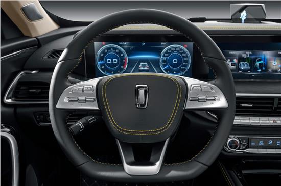 同时,奔腾T77 PRO 2021款的内饰配备了连体双屏,全液晶仪表和中控屏的尺寸均为12.3英寸。两块屏幕都采用了雾面材质,能有效抑制反光,显示效果令人满意。车机系统功能丰富,支持车联网、GPS导航、语言交互、CarLife手机互联等常用功能。新车保留完整的多媒体按键,位于前排空调出风口下方。每个按键都采用了防滑设计,细节考虑周到。按键的段落感清晰,整个操作非常直接、干脆,具有高级感。