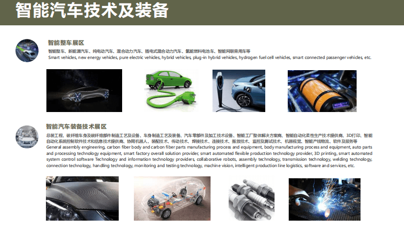 自动驾驶与车联网技术展区:主要包括ADAS高级辅助驾驶、通信系统、传感器、毫米波雷达、激光雷达、摄像头、夜视仪、芯片、动态地图技术、汽车导航、自动泊车系统、预防碰撞系统、车道保持系统、刹车辅助系统、立体视觉系统、电磁控制系统、人机交互系统、5G技术、车联网开发平台/工具、通信模块、车载操作系统、系统安全解决方案、汽车TSP、汽车App、内容提供商、车联网服务等; 车载显示技术展区:车载显示配套系统、车用触控显示模组、LCD、TFT-LCD、OLED、AMOLED、Micro-LED、Mini-LED、背光模组、触摸屏、3D玻璃、IML、IMD、PC、PMMA、全贴合材料设备、盖板/触摸屏/显示屏加工材料及设备等;汽车电子半导体展区:汽车零部件及车载系统、汽车半导体及元器件(电容器/冷凝器、传感器、连接器/电缆/线束、车载PCBs、摄像模组、通信模组等)、测试技术(检查与分析器件、车内网络系统软件、CAE软件、调试器、EMC电磁兼容测试等)、ECU制造及检测、汽车热管理、汽车电子应用材料及设备、车载软件及设计开发解决方案等汽车线束及连接器展区新能源汽车线束总成,动力高压线、电池BMS采集线、PACK插头、扎带;新能源汽车连接器、软管护套;线束与连接器生产设备、检测和测试等测试技术展区ECU 测试工具/软件、ECU 诊断和验证服务、测试,检查与分析器件/车内网络系统软件、CAE 软件、调试器等;车联网展区5G技术、车联网开发平台/工具、通信模块、车载操作系统、系统安全解决方案、汽车TSP、汽车App、内容提供商、车联网服务等智能汽车电子制造技术及设备展区汽车电子SMT技术设备及装配技术、焊接设备及材料、点胶技术、测试测量&3D 扫描,精密加工、车载PCBs及电路载体制造、电子制造自动化设备等; |