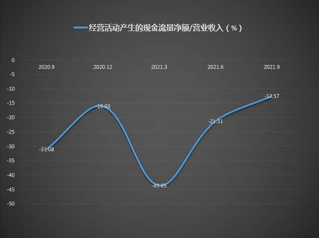 数据还显示,2021年1-9月,有方科技应收账款4.59亿元,占总资产比例31.3%。2018年-2020年,有方科技的应收账款分别是3.06亿元、3.72亿元、2.9亿,占比分别是40.96%、37.72%、29.3%。 现金流方面,前三季度经营活动现金流量净额-8607万元,占营收比重为-12.57%,通过下图,可以明显看出现金流连续五个季度负增长。不仅如此,2017年-2020年,该公司的现金流净额分别是-6167.39万元、-8743.65万元、-203.71万元、-9194.33万元,累计流出资金高达3.29亿。