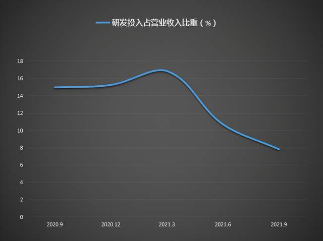 众所周知,车联网产品主要包括车载前装终端和车载后装终端两大类。车联网的终端市场竞争激烈,可谓是一片红海。 有方科技恰好在车联网产业链中处于弱势地位,其产品大多集中于其后端市场。有方科技仍需加大研发投入开拓前装市场,该公司在业绩说明会上也曾表示,将持续保持车联网领域的投入,新型智慧城市领域今年处于初步阶段,未来几年将逐步上升为公司重要的领域,但是,研发是需要资金作支撑的,从财务数据来看,账上1.9亿资金烧不了多长时间,现金流方面或许是有方科技要面临的一个大挑战。 值得关注的是,有方科技前三个季度的研发总投入合计6339万,同去年比减少1.93%,营收占比同比去年下降5.7%。第三季度的研发投入合计1926万,同比减少20.94%,占营收比例为7.07%,同比减少8.84%,下滑颇为明显。