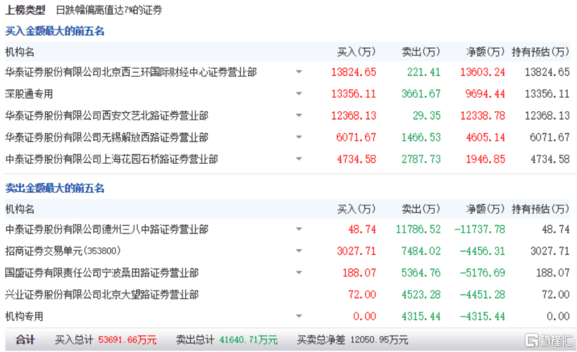 结果,晚上风平浪静,啥事都没有。而今日早盘四维图新高开高走,并准时准点在10点封板,封板可谓一气呵成,板上最高封单额达到16亿,涨停成交额达,这么大封单资金量不禁让众多投资者瞠目结舌。 由于意外跌停,涨跌幅偏离值过大,四维图新昨日收盘后登上龙虎榜。 从这份榜单,我们可以看出,虽然公司跌停,但买卖分歧极大,单单买入净额就达1.2亿元。 榜单各路资金“干架”明显,其中,中泰证券德州三八中路营业部是砸盘的主要推手,而华泰证券北京西三环路携手华泰证券西安文艺北路大笔逆势抄底,买入净额均超亿元,而北向资金也逆势买入净额将近1亿元。