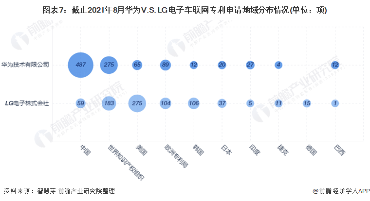 (3)专利申请地域对比:中美分别为两者主要布局区域 目前,LG电子的车联网专利申请区域主要集中在美国,而华为的车联网专利申请区域主要集中在中国。两者在美国申请的车联网专利数量分别为275项和65项;在中国申请的车联网专利数量分别为59项和487项。